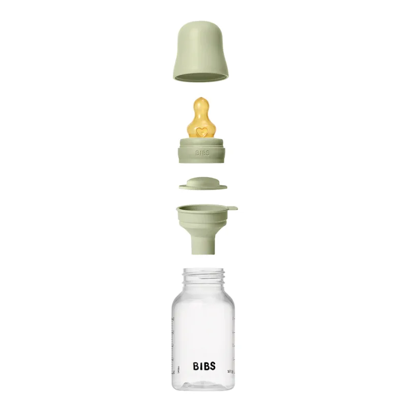 Biberon rond BIBS 150 ml en latex, tétine Slow Flow, couleur Sage : idéal dès la naissance pour une tétée naturelle, douce et proche du sein. Un biberon doux, sûr et parfaitement pensé pour accompagner bébé dès ses premiers repas.