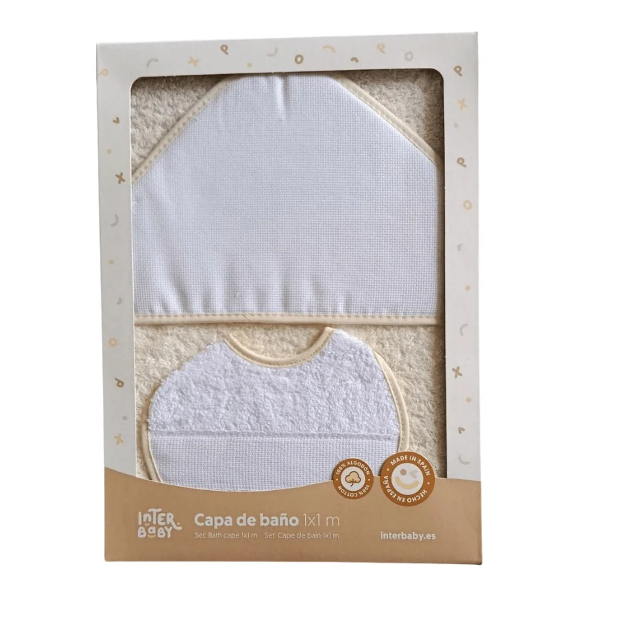 Cape de bain douce avec bavoir assorti, dimensions 1×1 m, fabriquée dans une matière douce, absorbante et agréable pour la peau délicate des tout-petits, cette cape enveloppe bébé pour le sécher rapidement tout en le gardant au chaud.