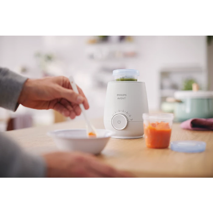 Chauffe-biberon rapide Premium – Avent Philips est conçu pour réchauffer le lait ou les aliments pour bébé en quelques minutes, en assurant une température constante grâce à une commande intelligente. Il est un appareil électrique conçu pour simplifier la préparation des repas de bébé en offrant un moyen rapide et sûr de réchauffer et décongeler le lait et les aliments