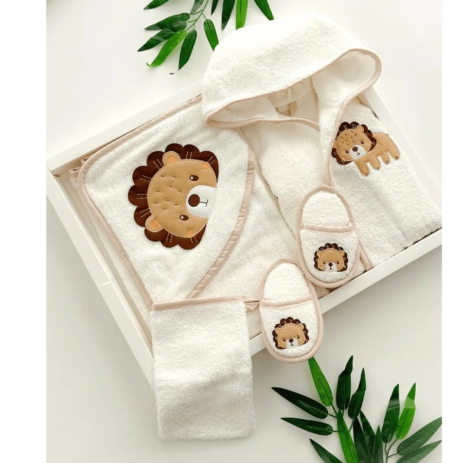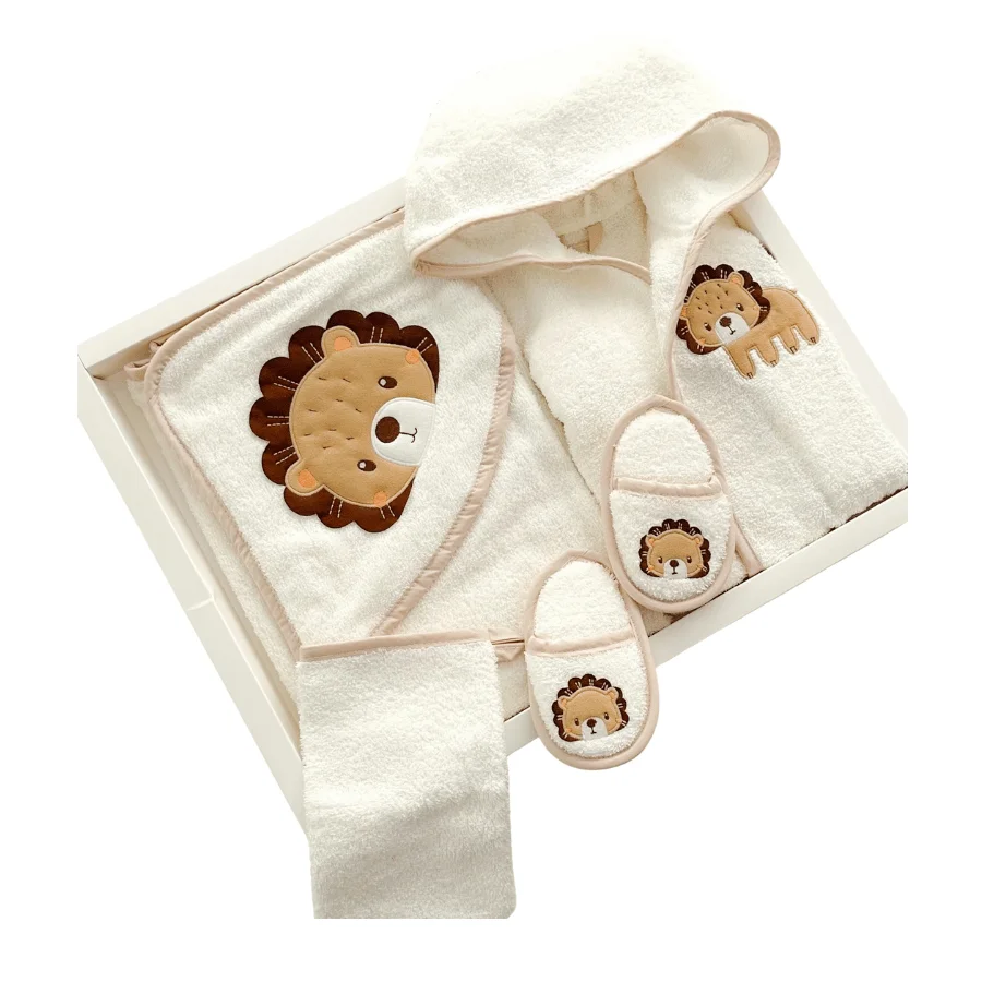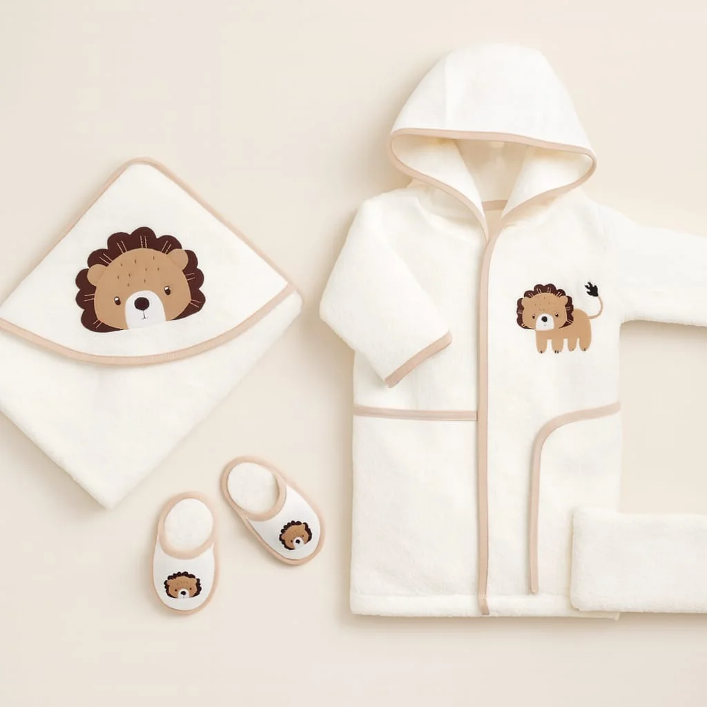 - Comprend : Peignoir à capuche motif lion, Serviette à capuche assortie, Gant de toilette doux et Paire de chaussons coordonnés