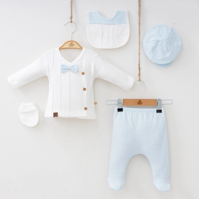 Le coffret naissance garçon 5 pièces bleu-blanc – Mini Zeyn est spécialement conçu pour accueillir bébé avec douceur, confort et élégance dès ses premiers jours.