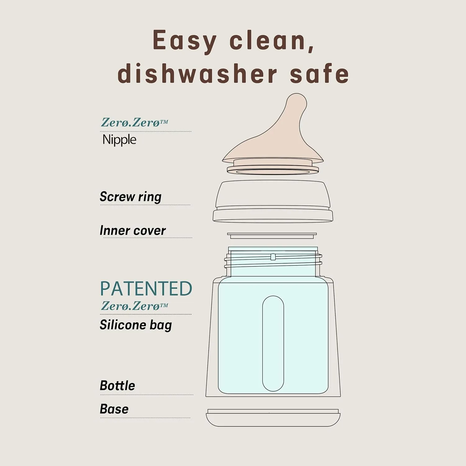 Le biberon est équipé d’un sac anti-colique semi-rigide en silicone, résistant et flexible, qui se rétracte naturellement pendant la tétée. Ce système innovant :