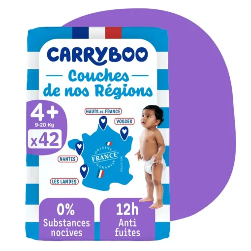 Couches écologiques taille4+ (9-20kg) 42 unités – Carryboo, ou couches « De Nos Régions » conviennent aux enfants pesant entre 9 et 20 kg, ces couches allient sécurité optimale et tendresse au quotidien pour votre bébé. Elles sont conçues pour assurer une protection et un confort inégalés, tout en intégrant des valeurs fortes qui font la différence.