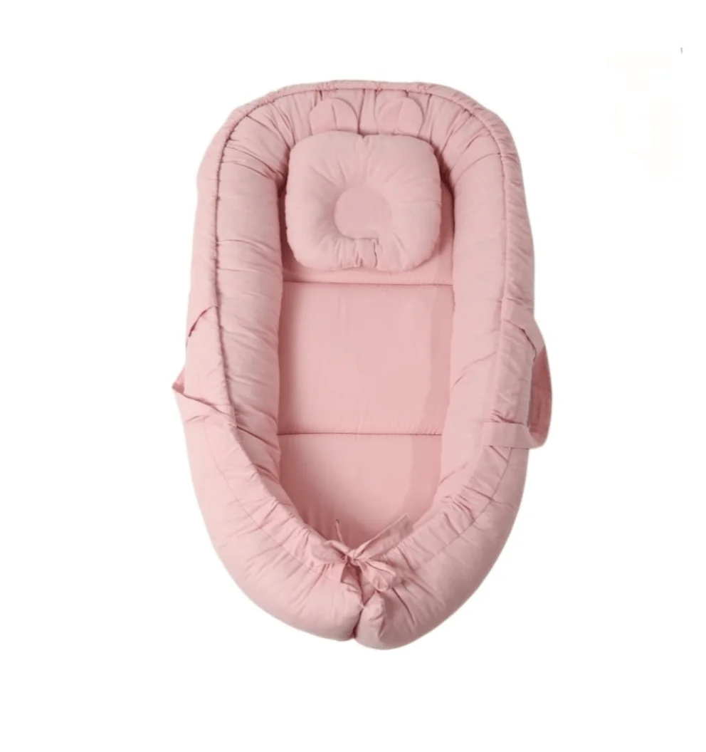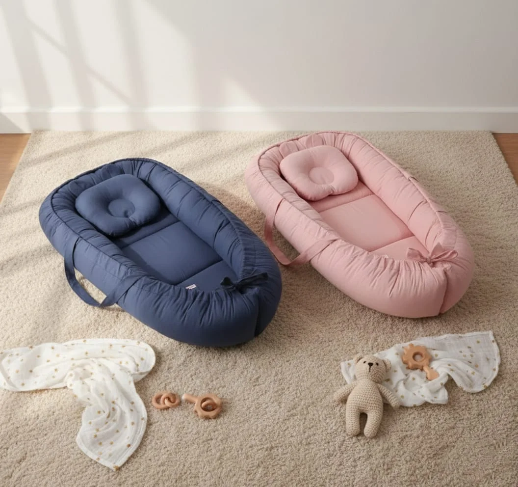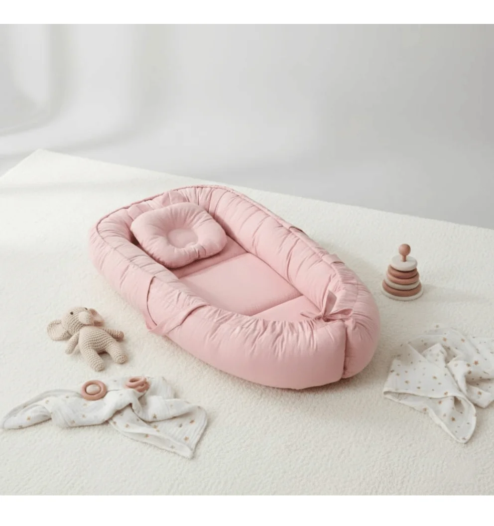 Le Couffin Nest bébé avec oreiller – Bebekevi est conçu pour offrir à votre nouveau-né un cocon rassurant et confortable dès ses premiers jours. Grâce à ses bords rembourrés, il crée un espace sécurisé qui aide bébé à se sentir protégé pendant le sommeil.