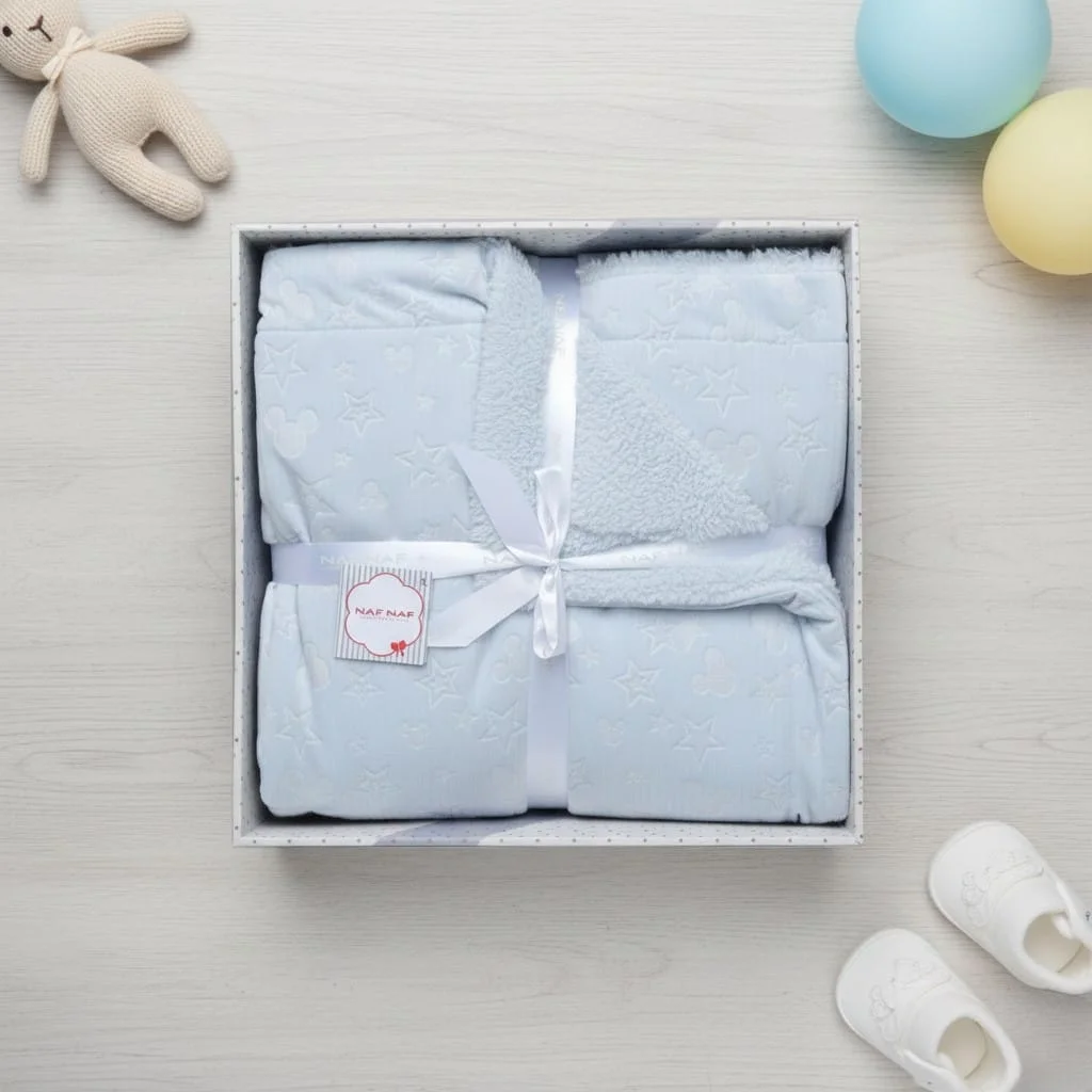 Couverture Naf Naf bleue en peluche douce imprimée étoiles, dimensions 110 × 140 cm. Elle offre une finition d’une qualité irréprochable et un toucher incroyablement doux et moelleux pour garder votre bébé bien au chaud et confortable.