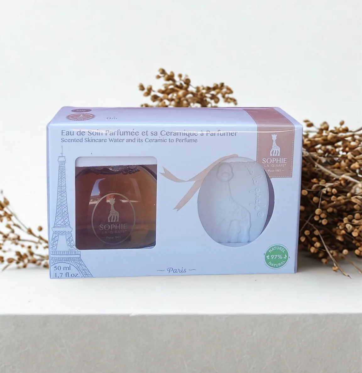 Eau De Soin Parfumée Et Céramique à Parfumer – Sophie la Girafe : Un duo parfait pour offrir une bulle de douceur à bébé dès ses premiers jours.