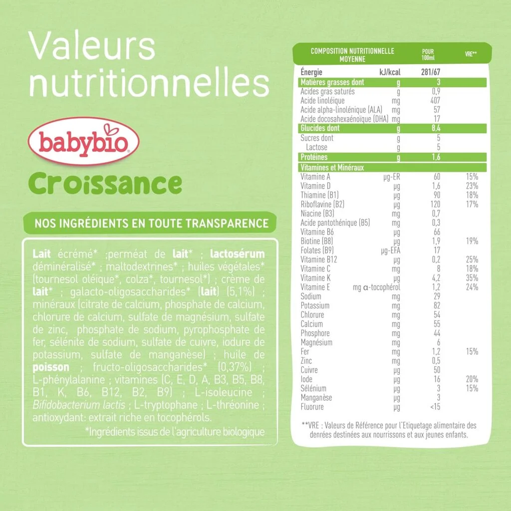 Le lait de croissance biologique en liquide – Babybio est spécialement formulé pour répondre aux besoins nutritionnels des jeunes enfants, dans le cadre d’une alimentation diversifiée.