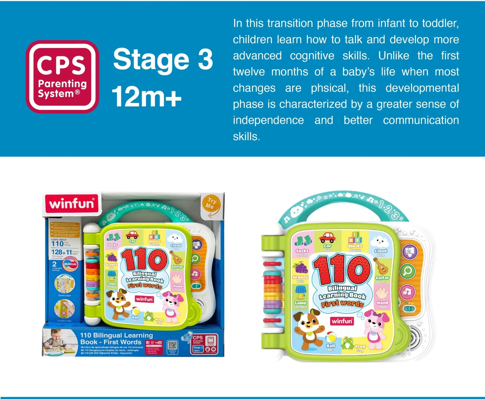 Livre d’apprentissage bilingue – Winfun enseigne 110 premiers mots en deux langues. Le livre est doté de pages interactives et de lumières clignotantes pour capter l’attention de l’enfant et rendre l’apprentissage amusant.