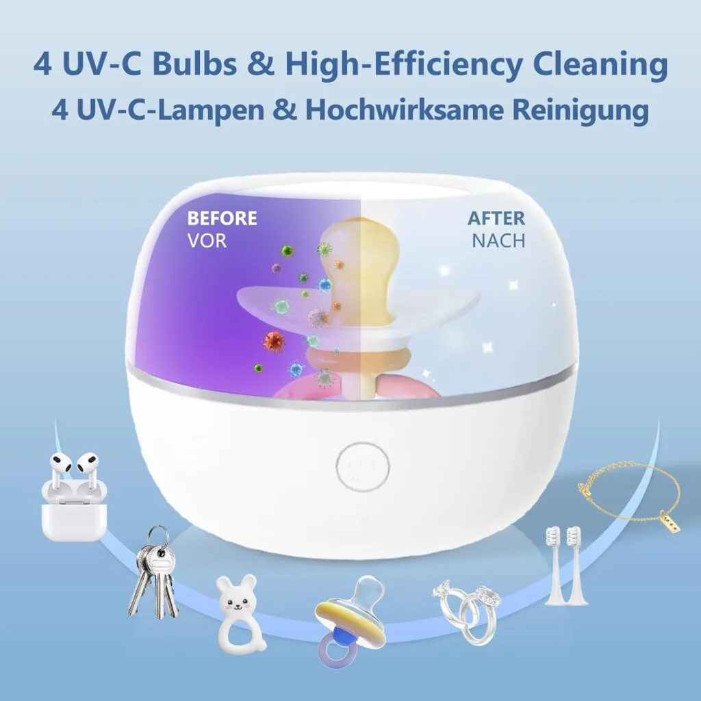 - Polyvalent : idéal pour stériliser sucettes, anneaux de dentition, écouteurs, bijoux, clés, coupe-ongles et autres petits accessoires.