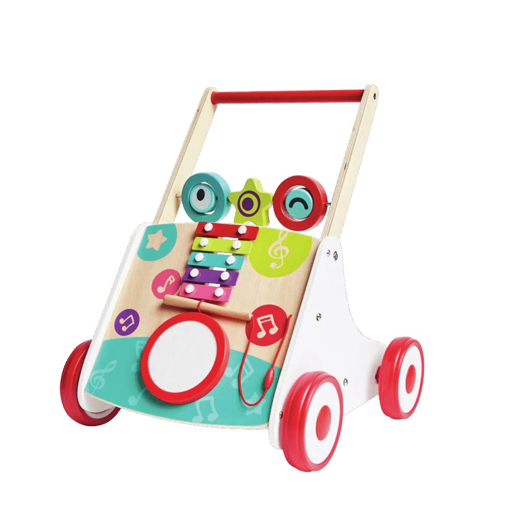 - Le trotteur musical de Hape comprend un tambour, un xylophone et trois blocs à faire tourner pour plus d’éveil musical.