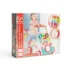 À l’avant du chariot, on trouve un tambour, un xylophone et trois blocs rotatifs avec lesquels l’enfant peut jouer séparément, encourageant le développement de la motricité fine et la coordination œil-main.
