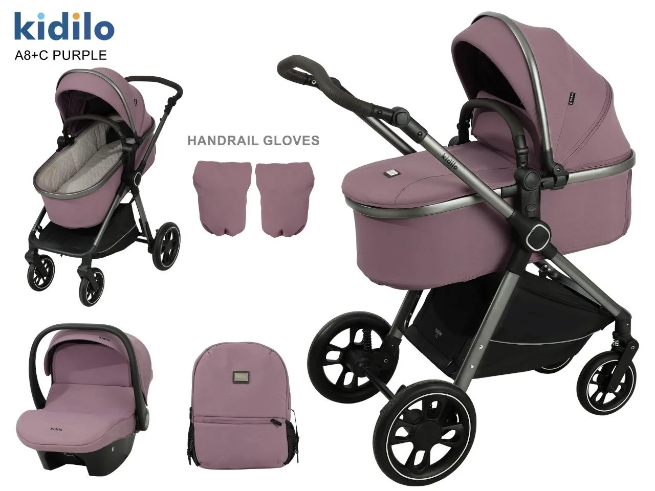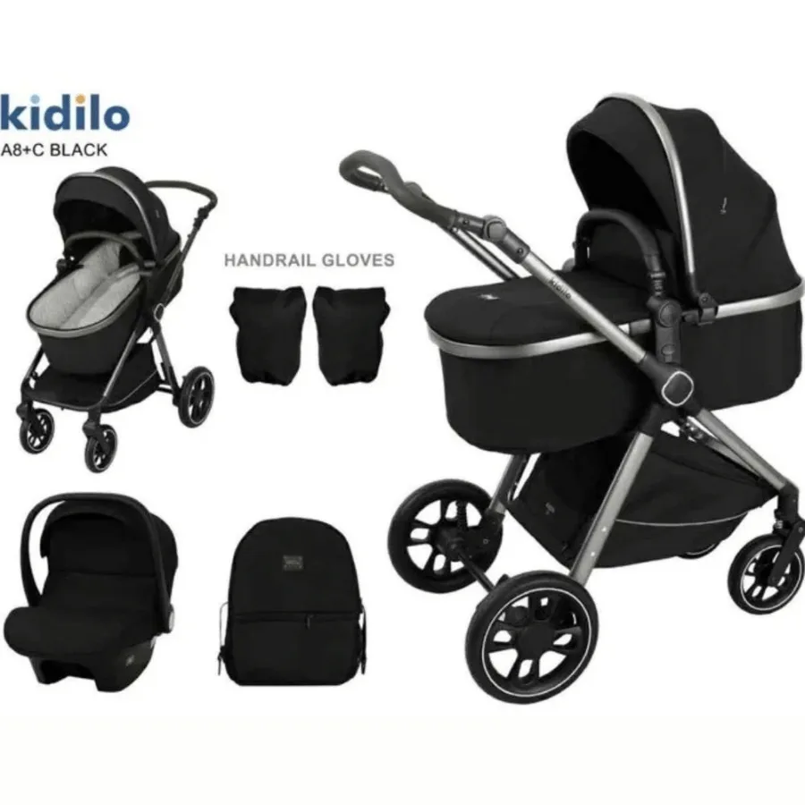 Pack Poussette A8+C Pour Bebe – Kidilo comprend tous les éléments nécessaires pour prendre soin de votre enfant dès la naissance. Il comprend une poussette, siège auto, couvre-pieds, habillage pluie, moustiquaire, sac à dos pour maman, gants de main courante et matelas.