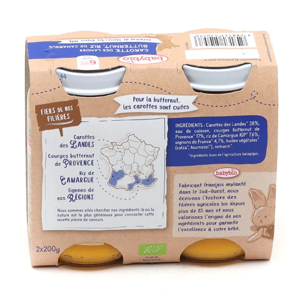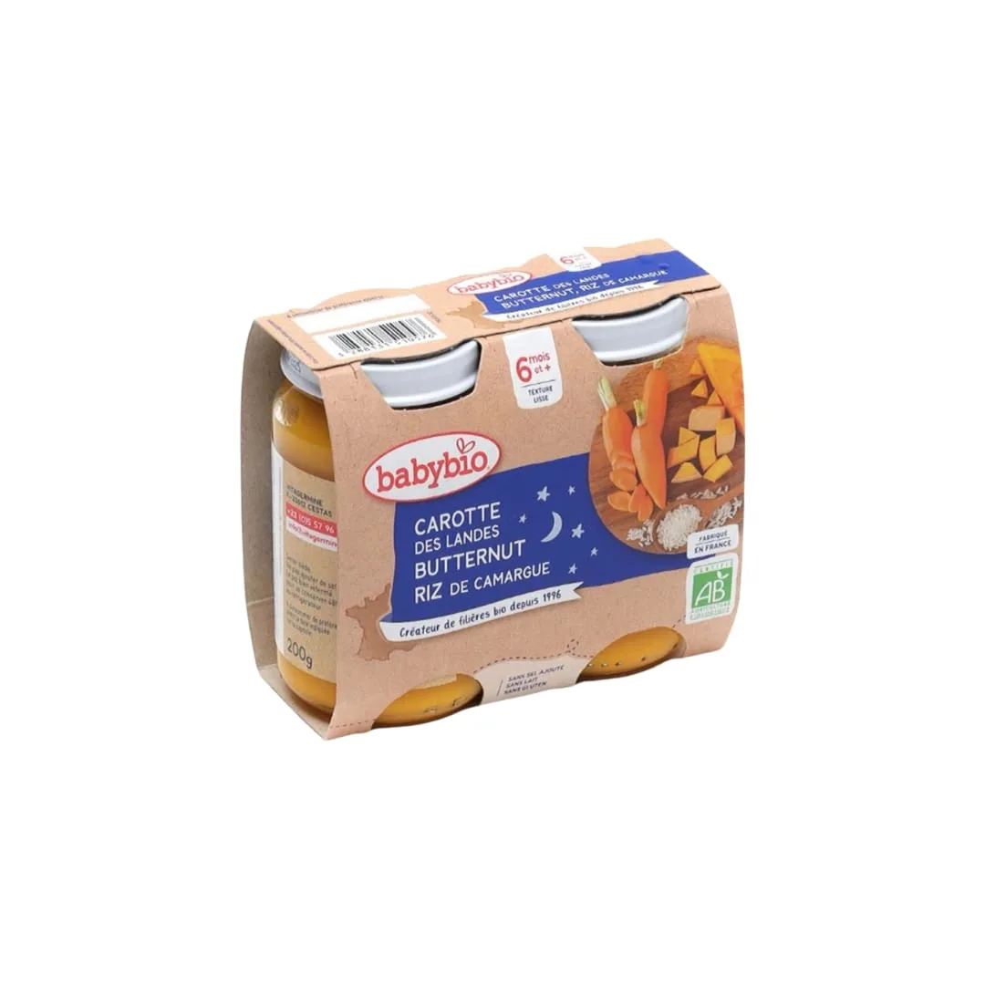 Petit pot bonne nuit carotte courge butternut riz Babybio, pour l’éveil aux saveurs naturelles de bébé et à son bon équilibre nutritionnel. Dès 6 mois.