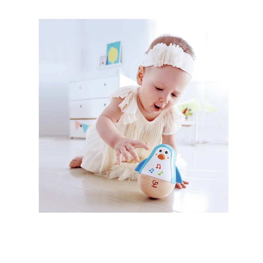 Penguin musical culbuto – Hape, en se balançant, le culbuto encourage les bébés à développer leur motricité globale et fine en essayant de l’attraper ou de le pousser. Il les incite aussi à ramper. Le jouet produit de doux tintements mélodiques et apaisants à chaque balancement, incitant l’enfant à interagir avec lui.