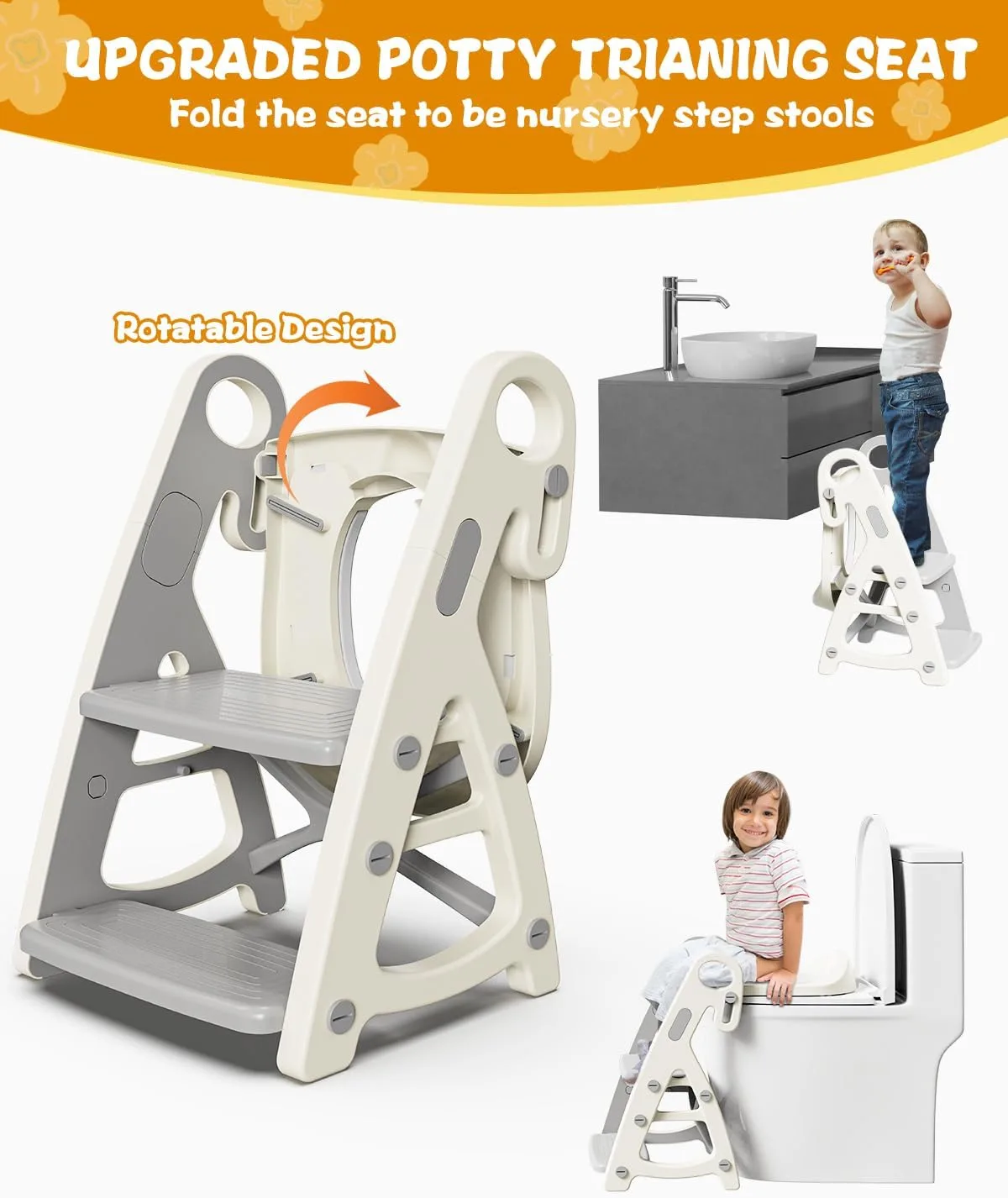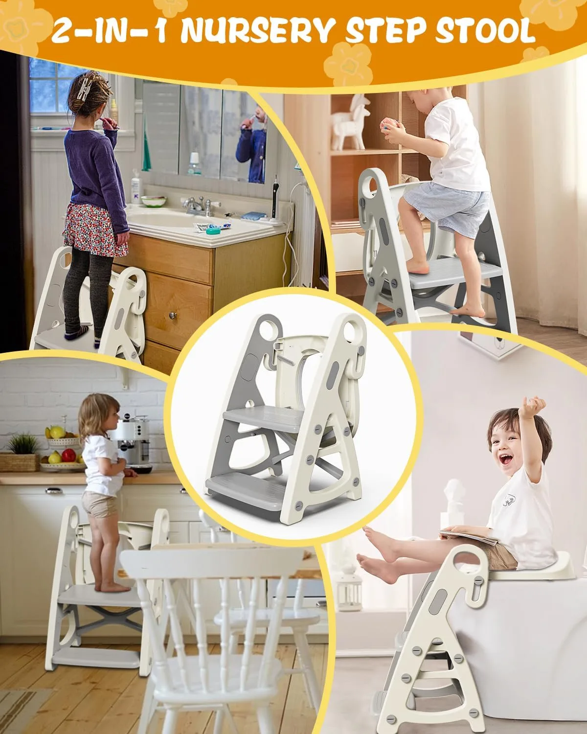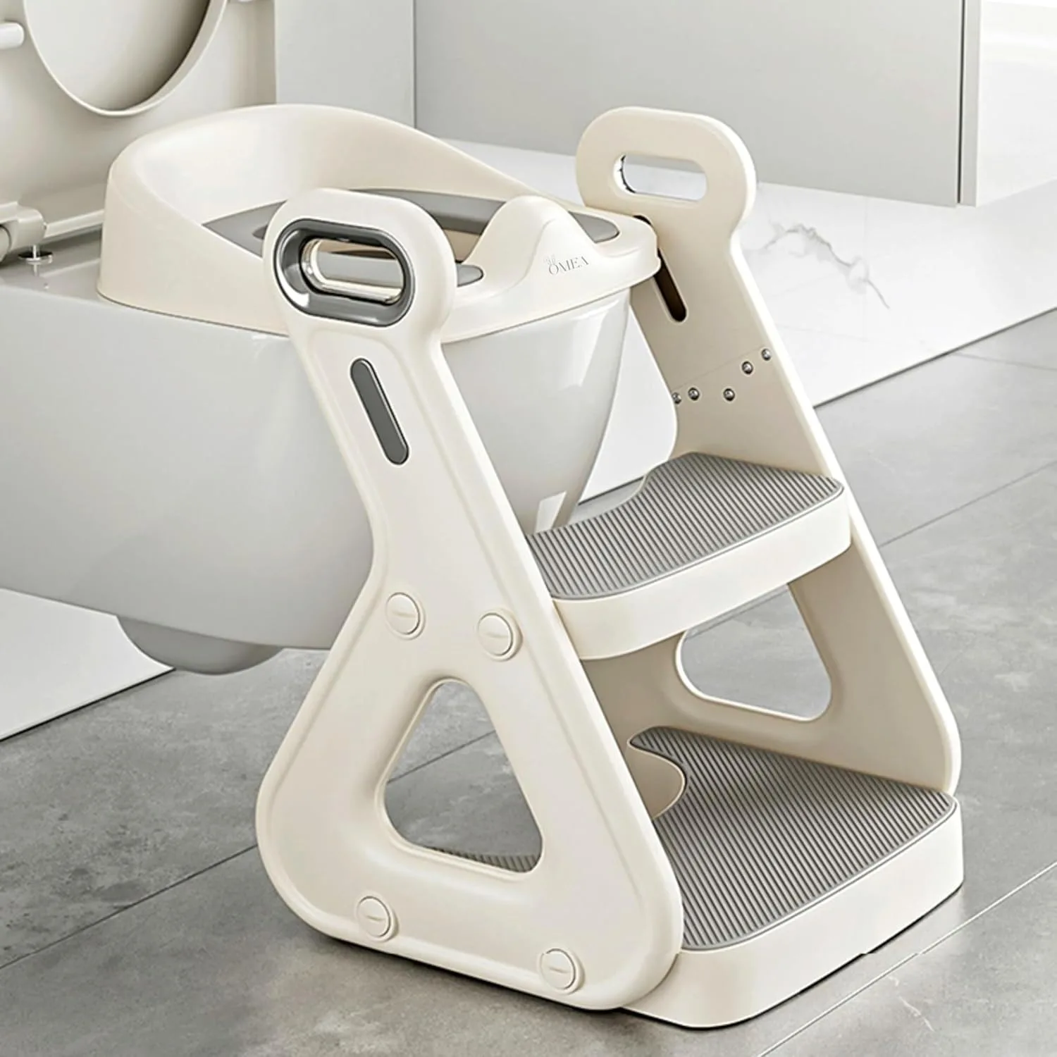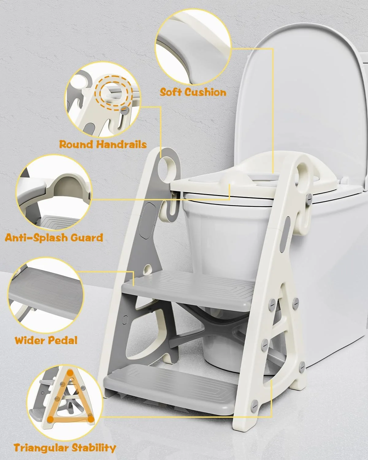 Réducteur Toilette Enfant 2en1 -BM avec escalier dispose de supports triangulaires étendus des deux côtés et de croix dorsales pour former une structure triangulaire multiple qui garantit une stabilité inégalée. Ce siège de toilette polyvalent peut être plié comme un marchepied pour que les enfants puissent atteindre des endroits plus élevés.